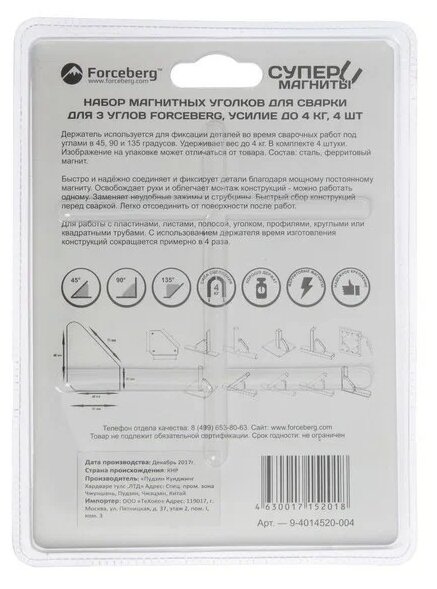 Forceberg Набор магнитных уголков для сварки для 3 углов , усилие до 4 кг, 4 шт 9-4014520-004 .