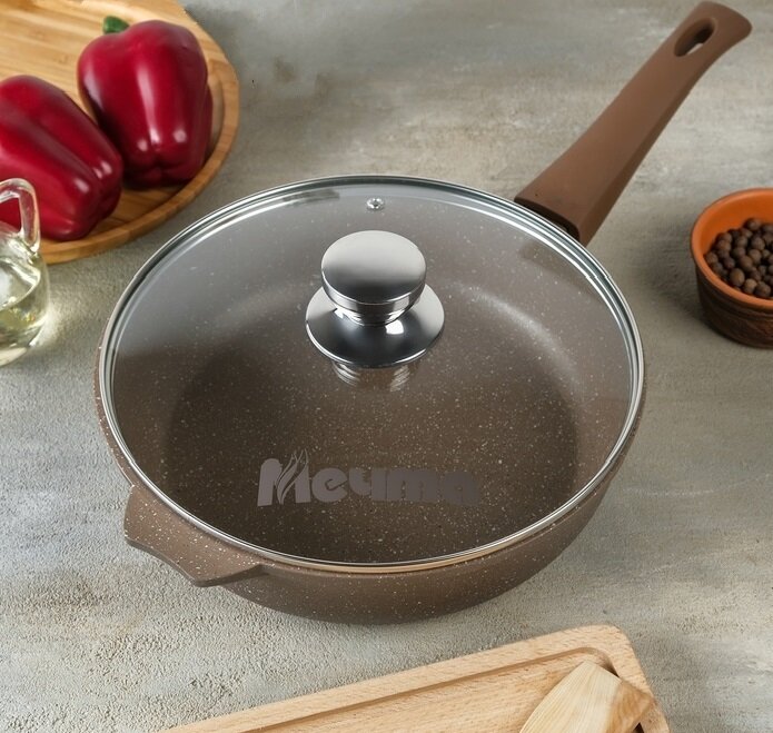СохранитьСковорода Мечта 28 см Гранит с антипригарным покрытием с несъемной ручкой и крышкой, НЕ индукционная интересное: