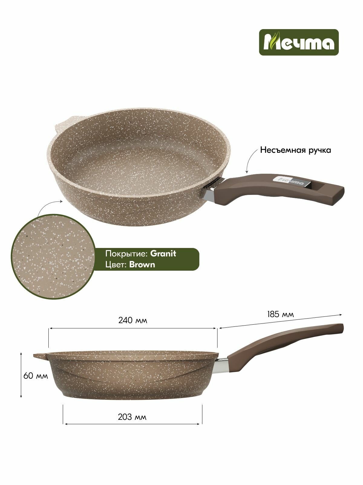 Сковорода Мечта 24 см Гранит с антипригарным покрытием с несъемной ручкой и крышкой, НЕ индукционная