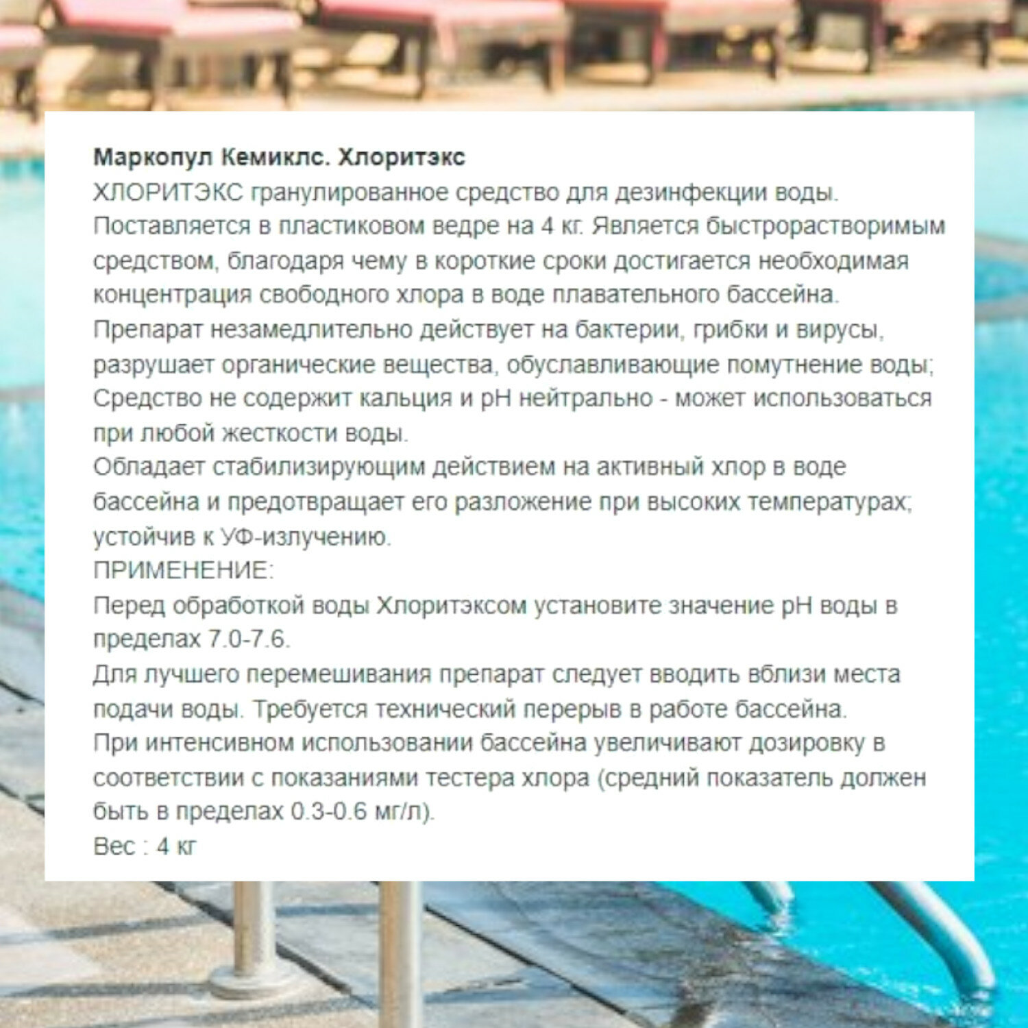 СохранитьХлоритэкс 4 кг, гранулы для дезинфекции воды, Маркопул кемиклс интересное: