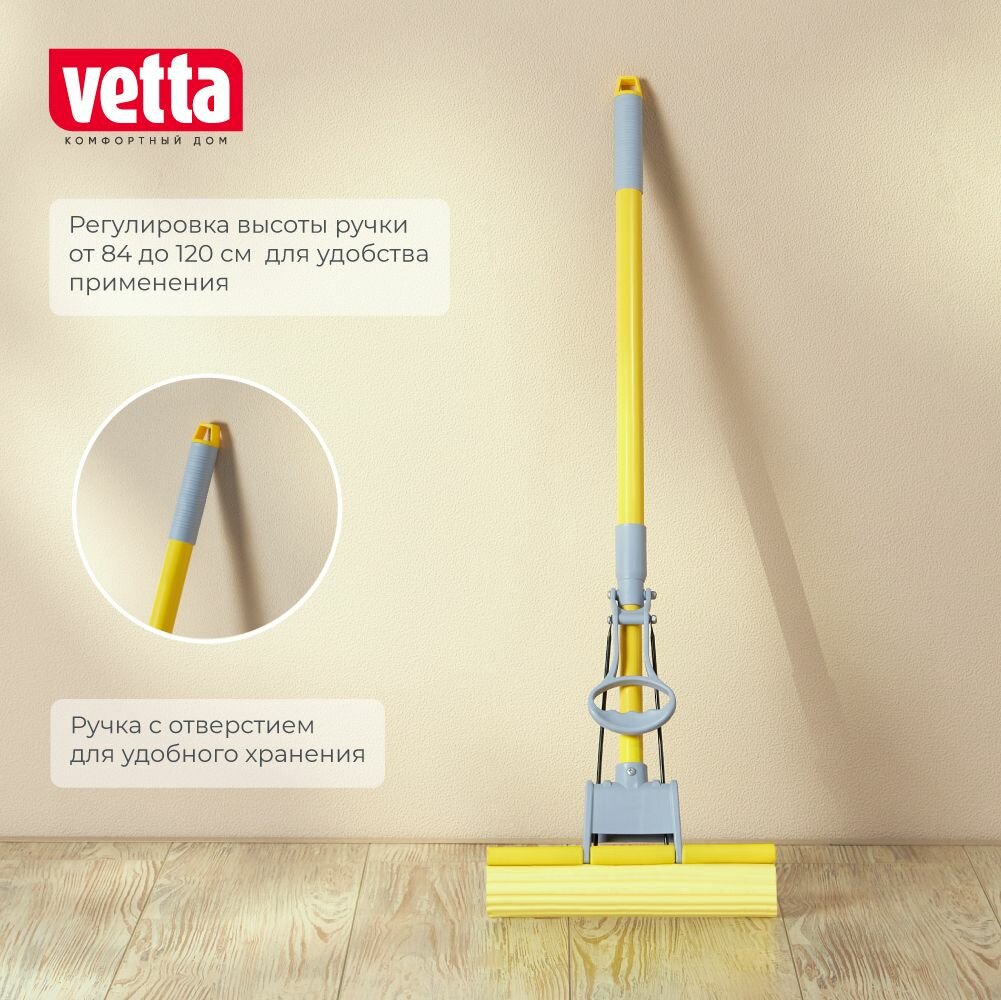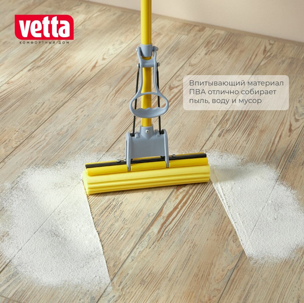 Швабра для мытья полов с отжимом Vetta, с насадкой ПВА, телескопическая ручка 120 см, 1 ряд роликов интересное: