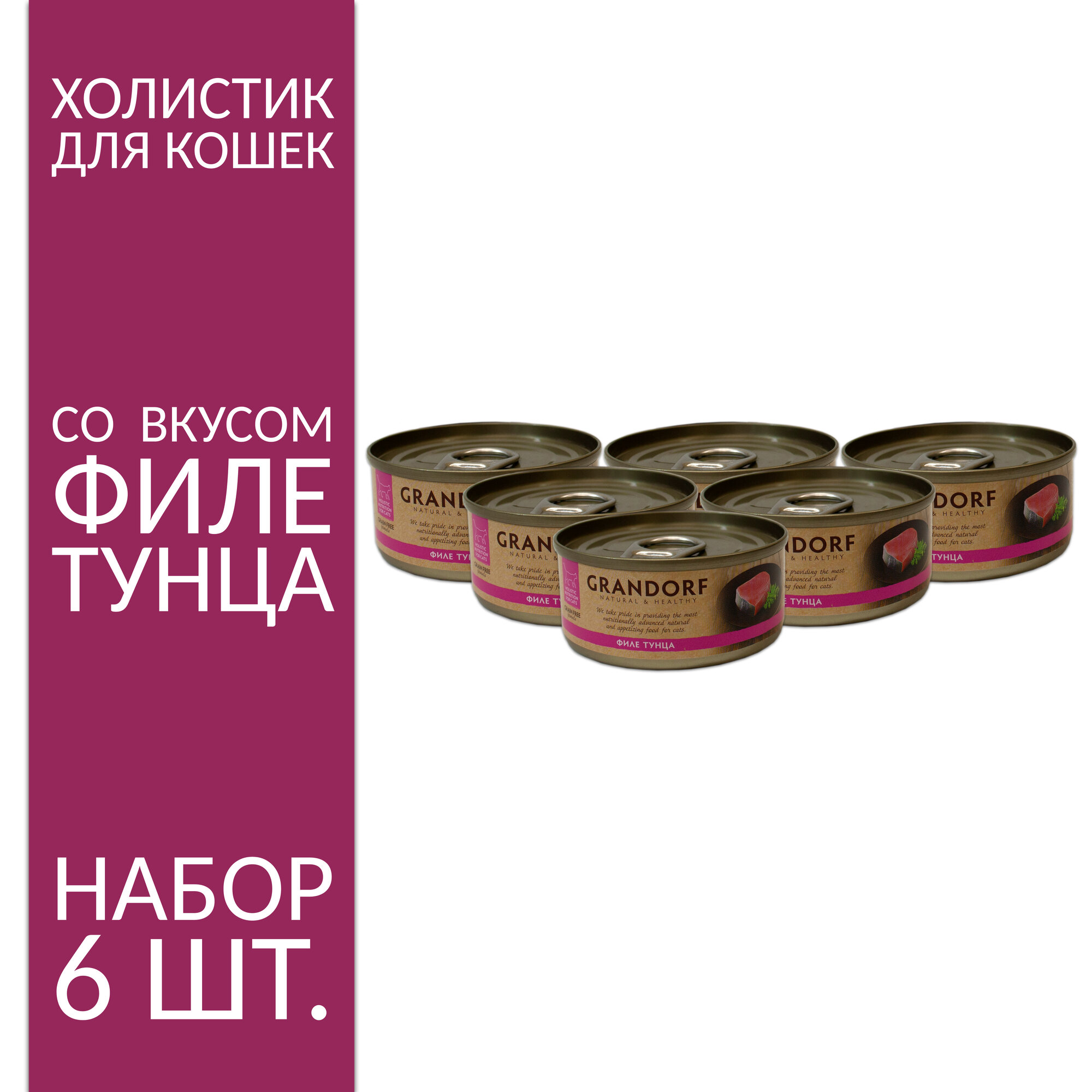 Grandorf Holistic Nutrition For Cat Grain Free влажные корма для котят и кошек холистик, филе тунца 6 банок х 70 гр