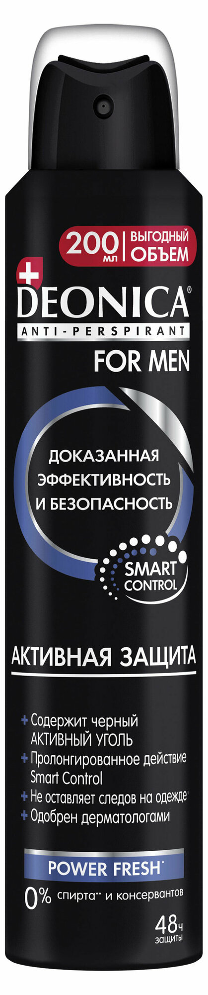 Дезодорант мужской антиперспирант Deonica For Men "Активная защита". Спрей, 200 мл. Содержит активный уголь, нейтрализующий бактерии. Не оставляет следов на одежде