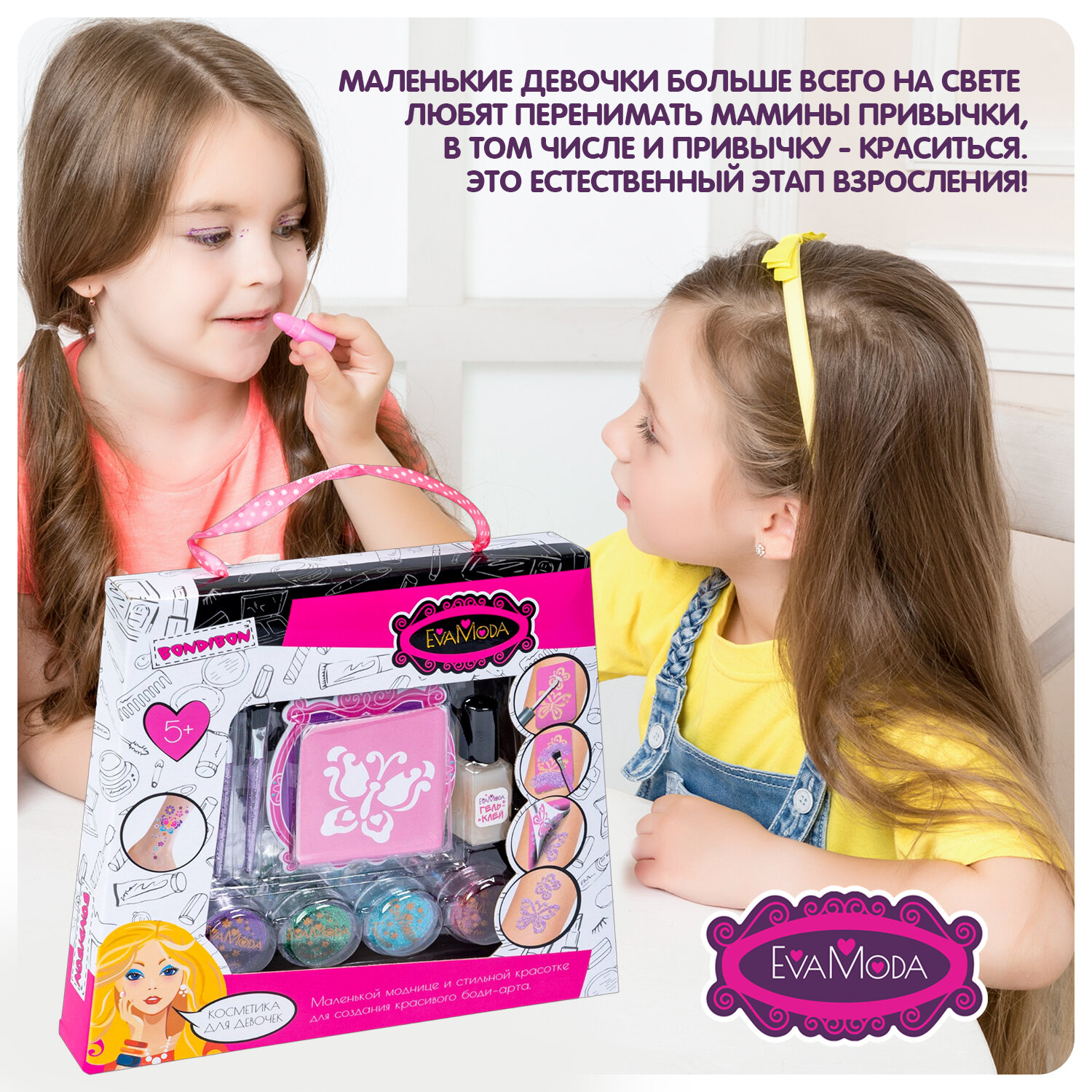 Набор детской декор. косметики Bondibon Eva Moda для боди-арта, BOX 21,5х19,5х3,5 см; глиттер для те
