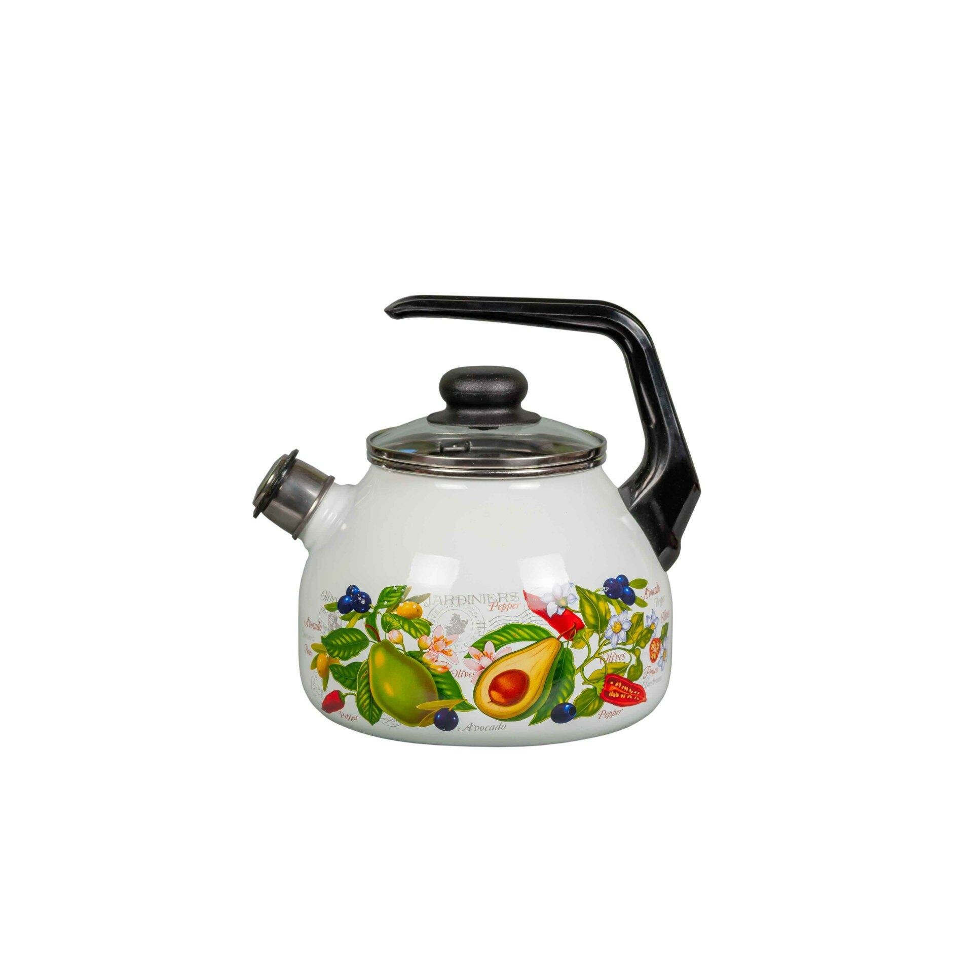 "Авокадо" Чайник эмалированный 2л, д19см, h13см, со свистком, сферическая форма, стеклянная крышка, белый
