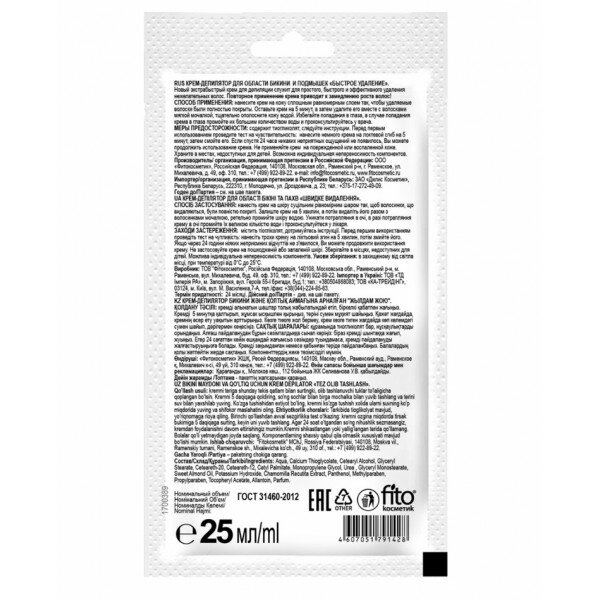 Депиляция рассвет/ Фитокосметик/Дом соусов/ДС Быстрое удаление крем д/депиляции 25 мл д/обл бикини и подмышек