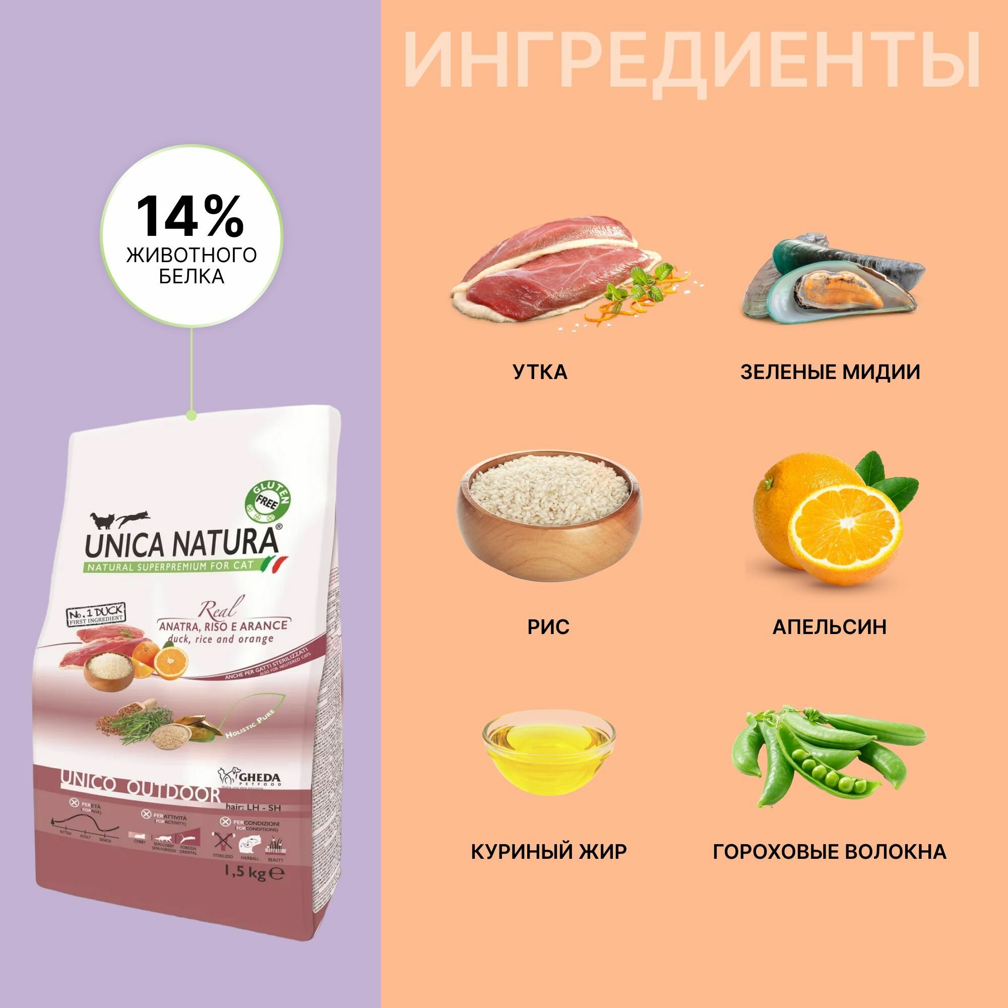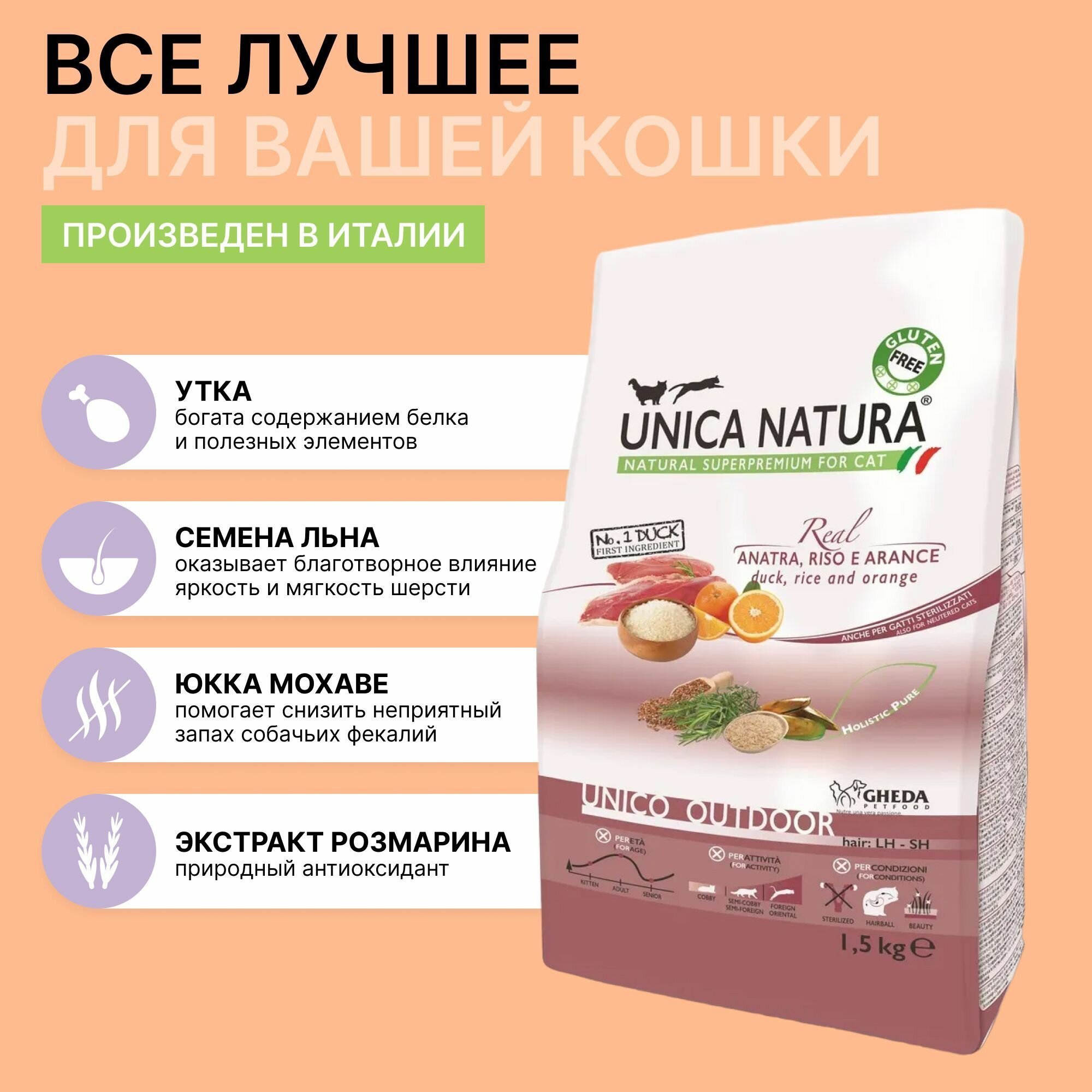 Корм для кошек сухой Unica Natura Outdoor без глютена с уткой, 1,5 кг. интересное: