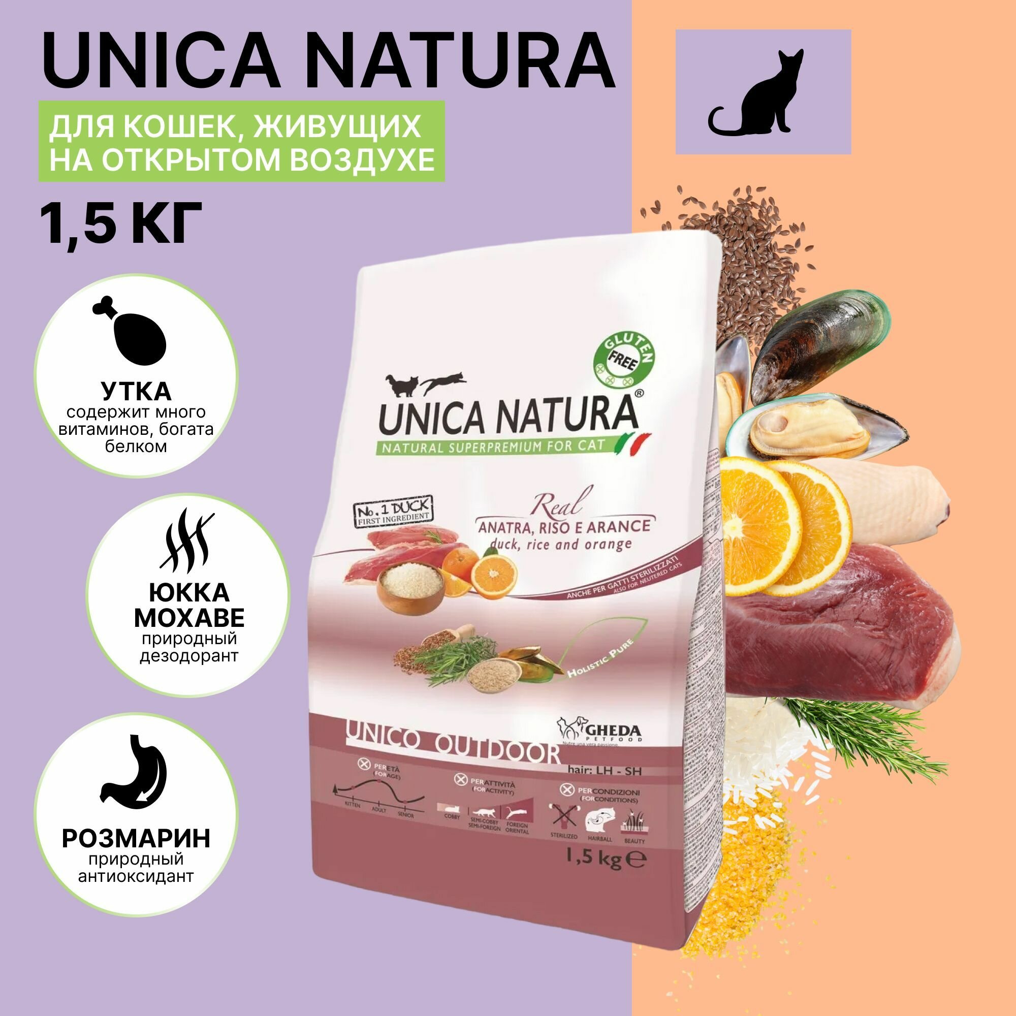 UNICA Outdoor сухой корм для кошек с уткой, рисом и апельсинами, 1,5 кг