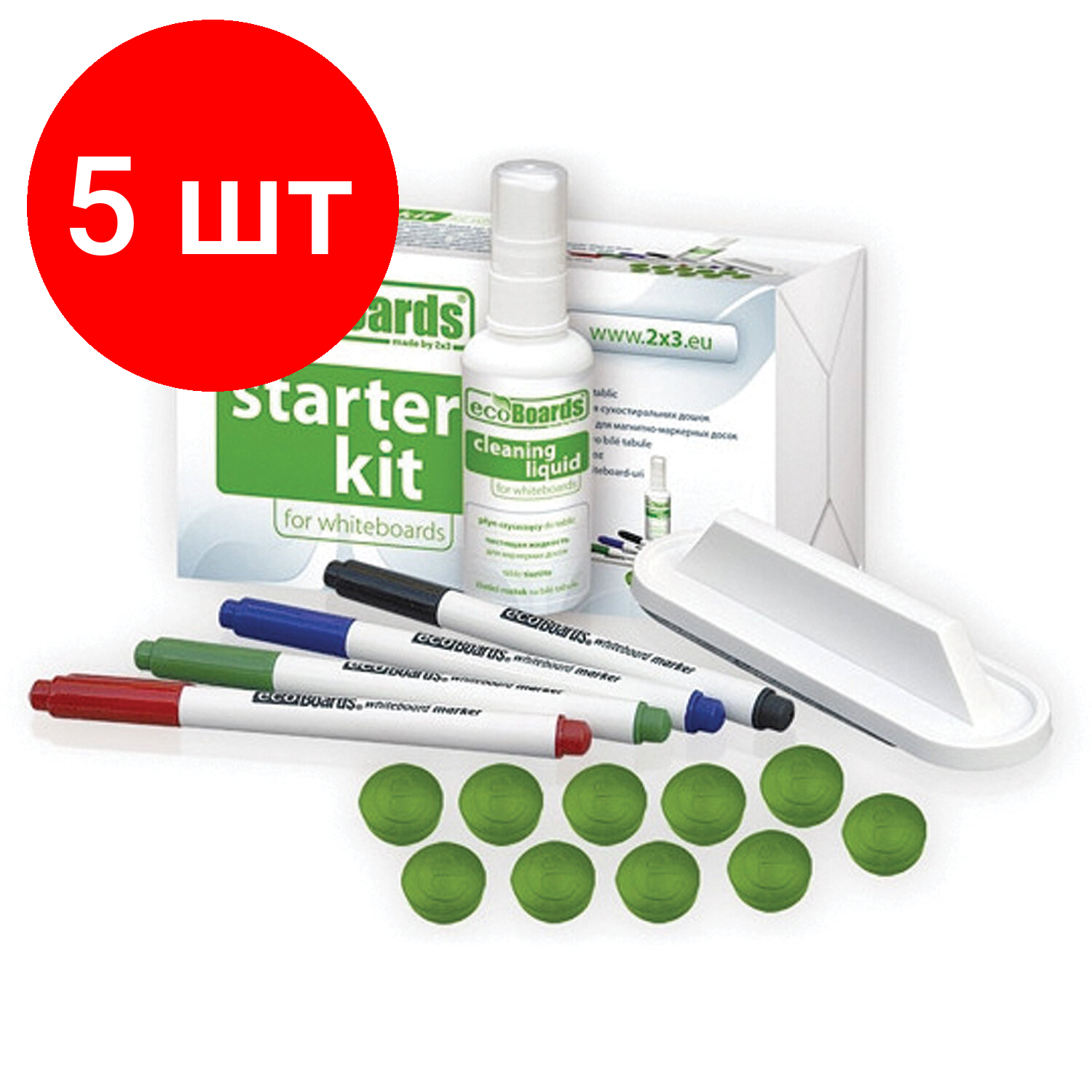 Набор для магнитно-маркерной доски (4 маркера + стиратель + чистящее средство + 10 магнитов), комплект 5 шт., "2х3" ecoBoards, AS116