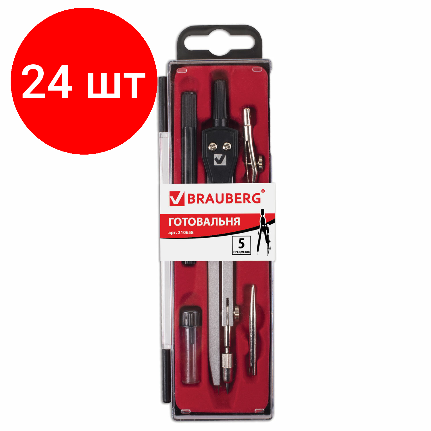 Купить Комплект 24 шт, Готовальня BRAUBERG "Architect", 5 предметов: циркуль 135 мм, 2 вставки, держатель, грифель, 210658