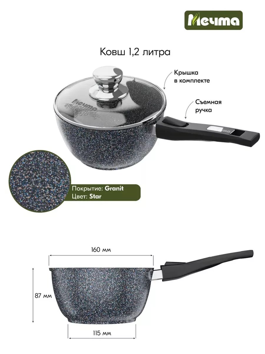 Ковш "Мечта" 1.2л Гранит с антипригарным покрытием со съемной ручкой и крышкой, можно мыть в посудомоечной машине