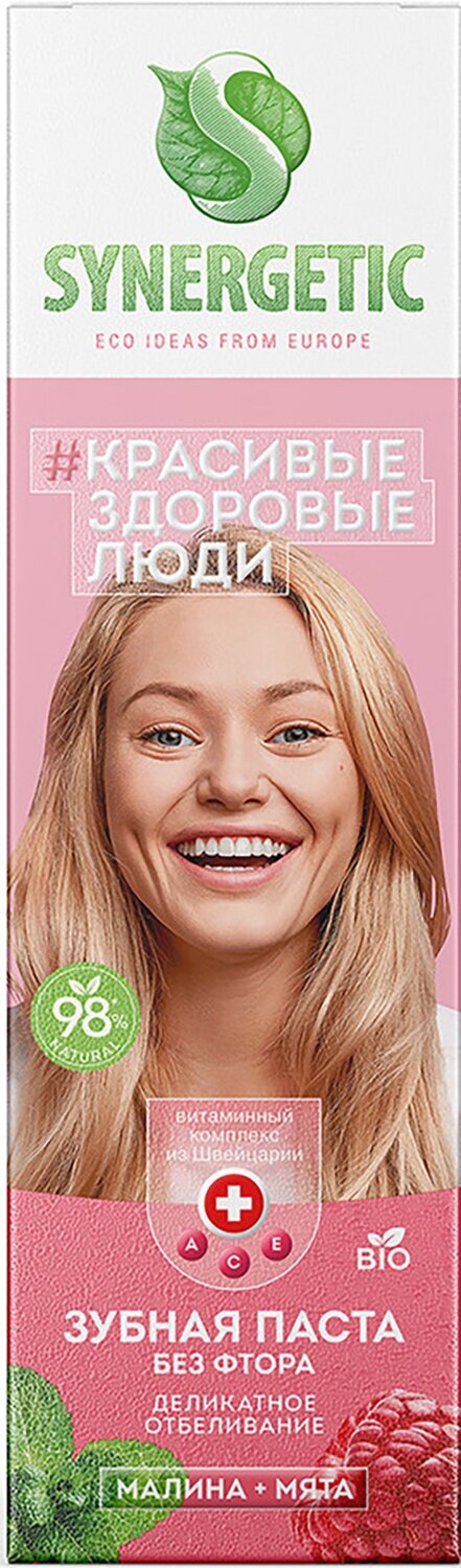 Зубная паста отбеливающая SYNERGETIC Деликатное отбеливание "малина + мята" натуральная, без фтора, 100г