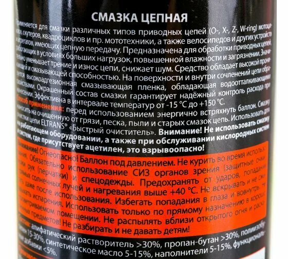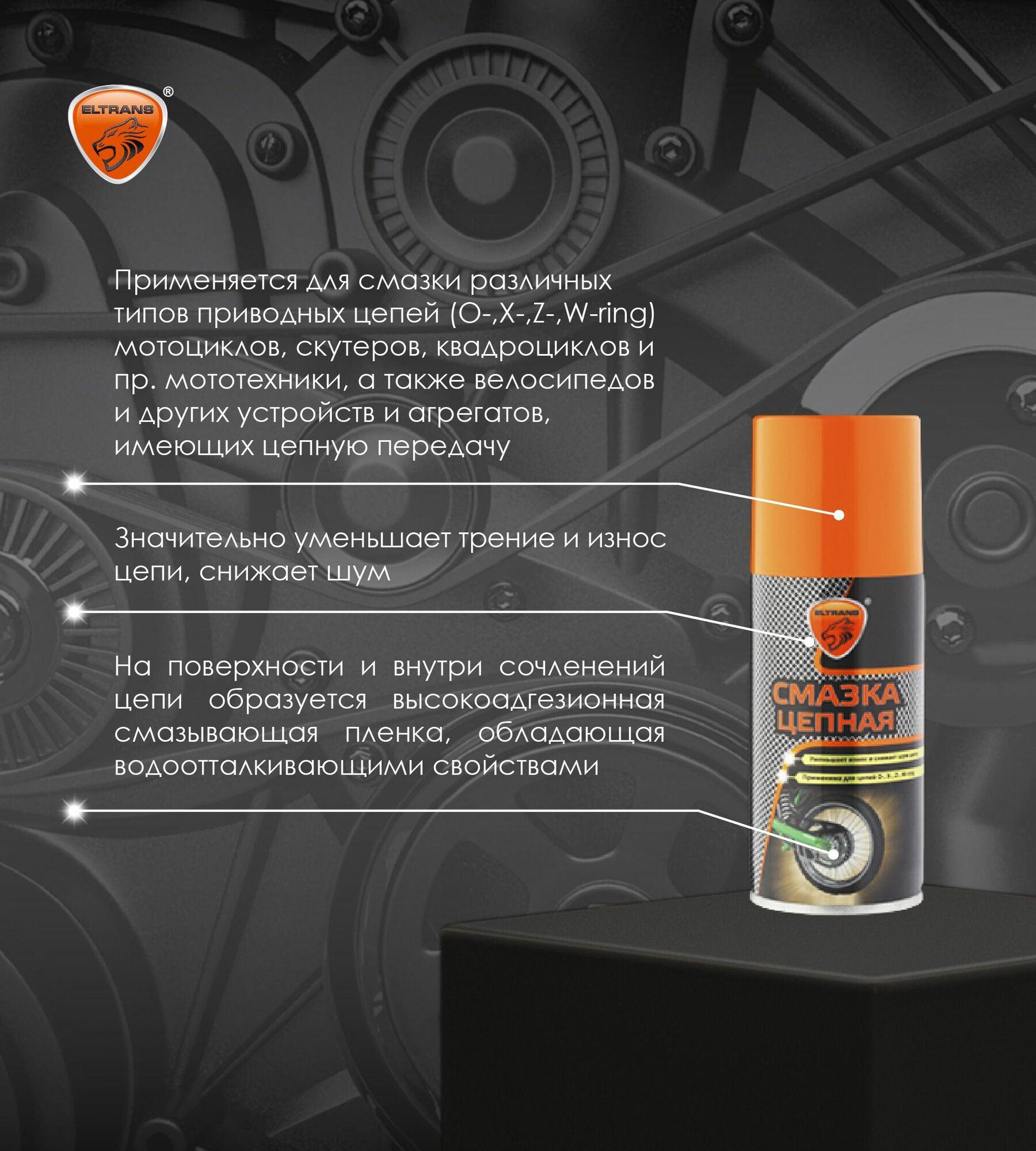 СохранитьСмазка цепей мототехники eltrans 210мл аэрозоль el-0509.02 интересное: