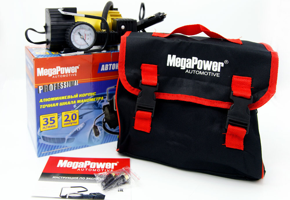 Ниже Вы можете прочитать отзывы на Компрессор автомобильный 35л/мин. 10атм. 14А 12V в прикуриватель (сумка) MEGAPOWER M-14001, ознакомится с подробными характеристиками, посмотреть интересные обзоры и фотографии на Компрессор автомобильный 35л/мин. 10атм. 14А 12V в прикуриватель (сумка) MEGAPOWER M-14001.