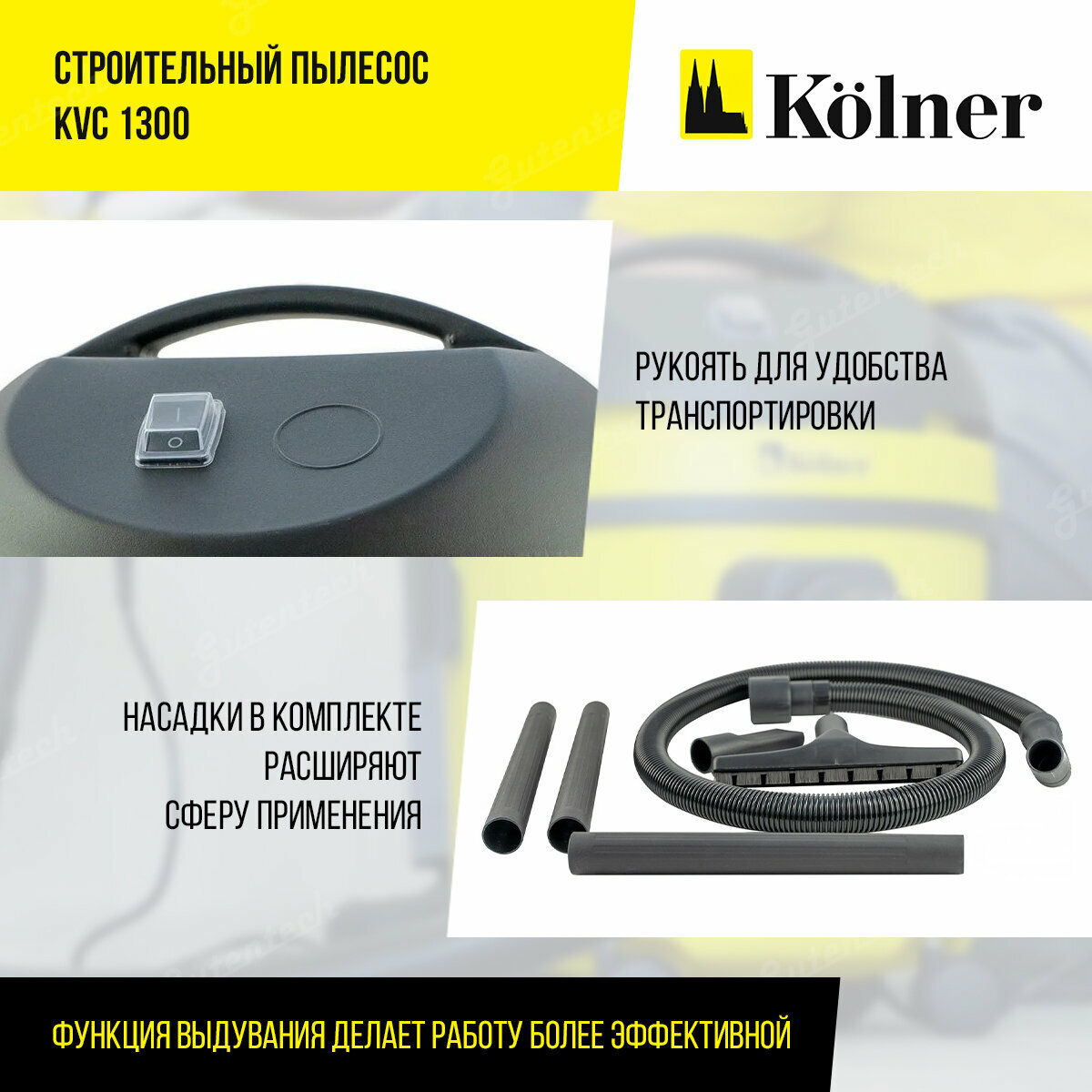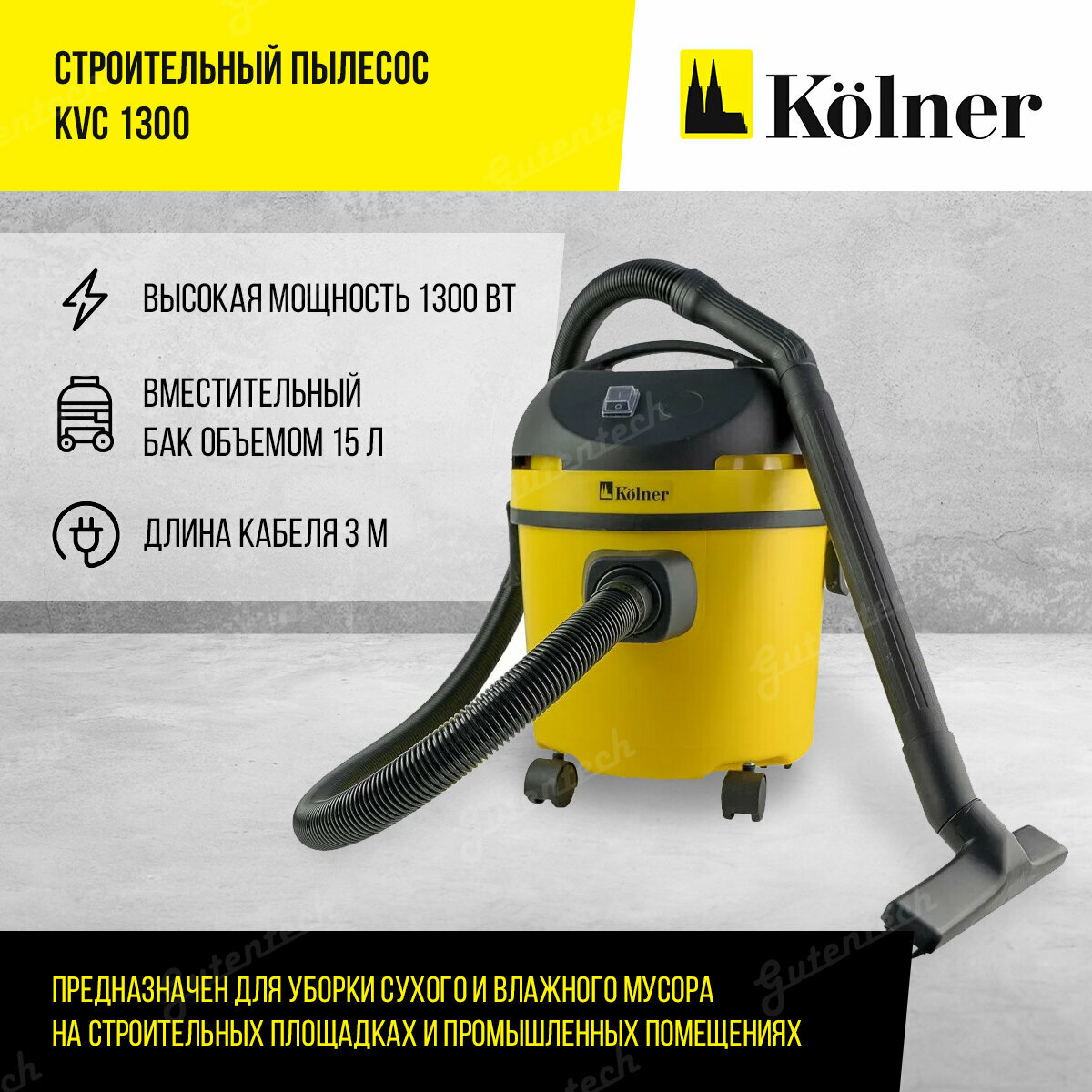 Строительный пылесос Kolner KVC 1300 1300Вт, объем бака 15л, Сухая/влажная уборка