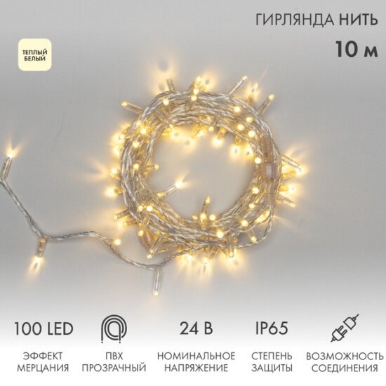 Гирлянда светодиодная Нить 10м 100 LED теплый белый белый ПВХ IP65 эффект мерцания 24В соединяется NEON-NIGHT нужен трансформатор 531-100/531-200 1 шт арт. 305-236