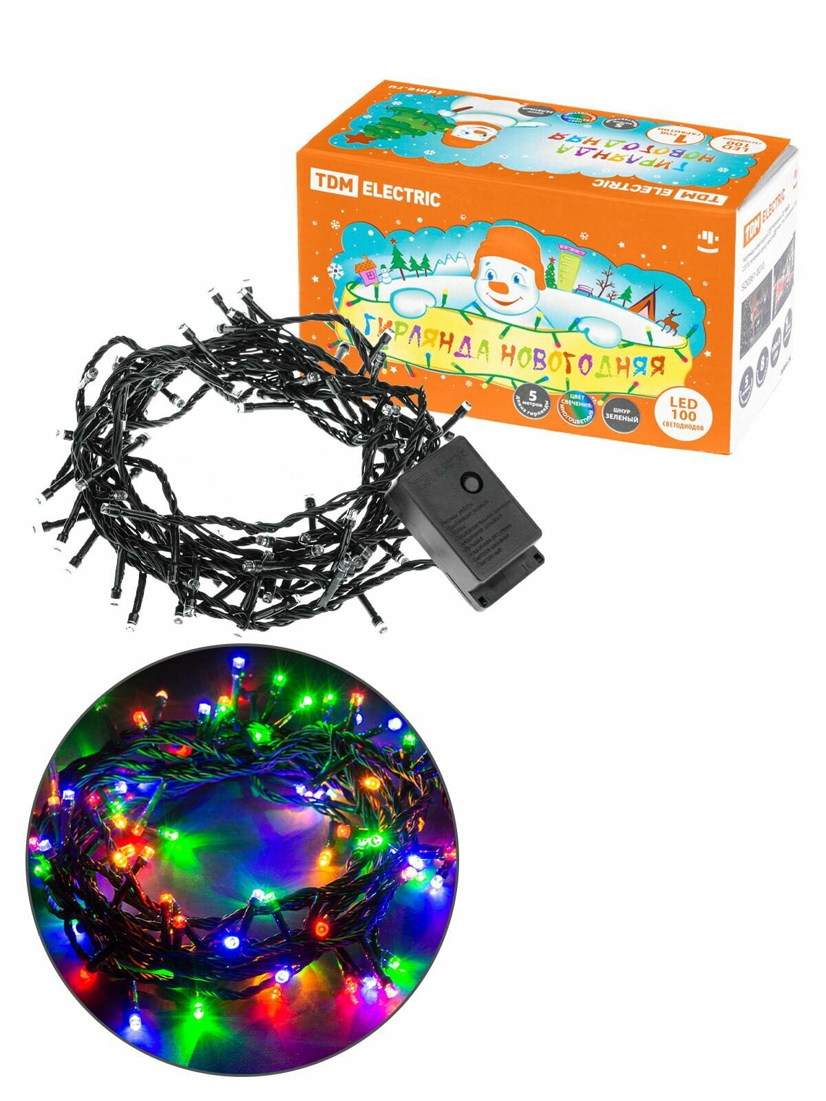 Гирлянда TDM ELECTRIC СГ100, 5 х 0.055 х 0.07 м, 0.07 х 0.055 м, 100 ламп, разноцветные диоды/зеленый провод
