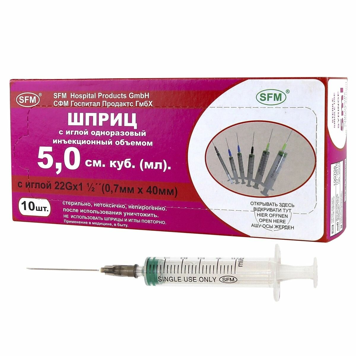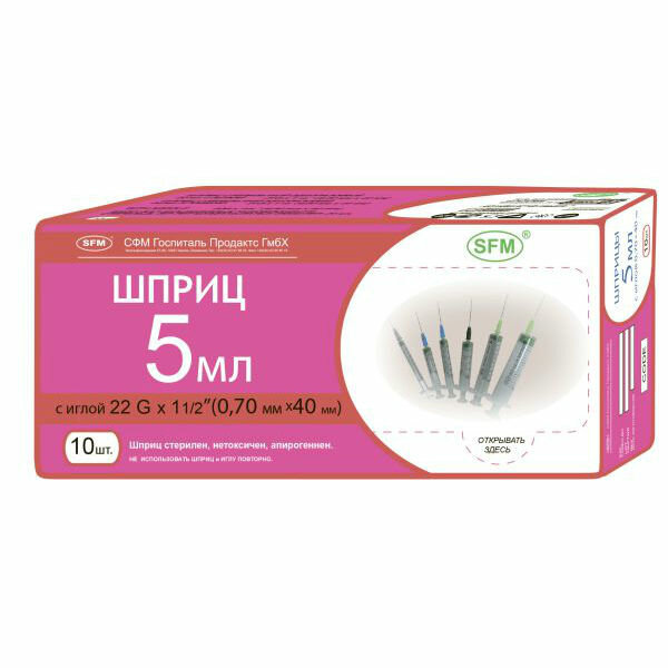 Шприцы СФМ Госпитал Продактс Шприц однораз 5мл 3-х комп игла (0.7х40мм) №10 SFM