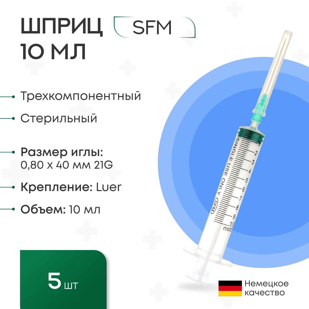 Шприц - 10мл. (3-х) SFM, Германия одноразовый стерилизованный с надетой иглой 0,80 x 40 - 21G, упаковка №5 (без латекса) (блистер). 3 упаковки по 5 шт