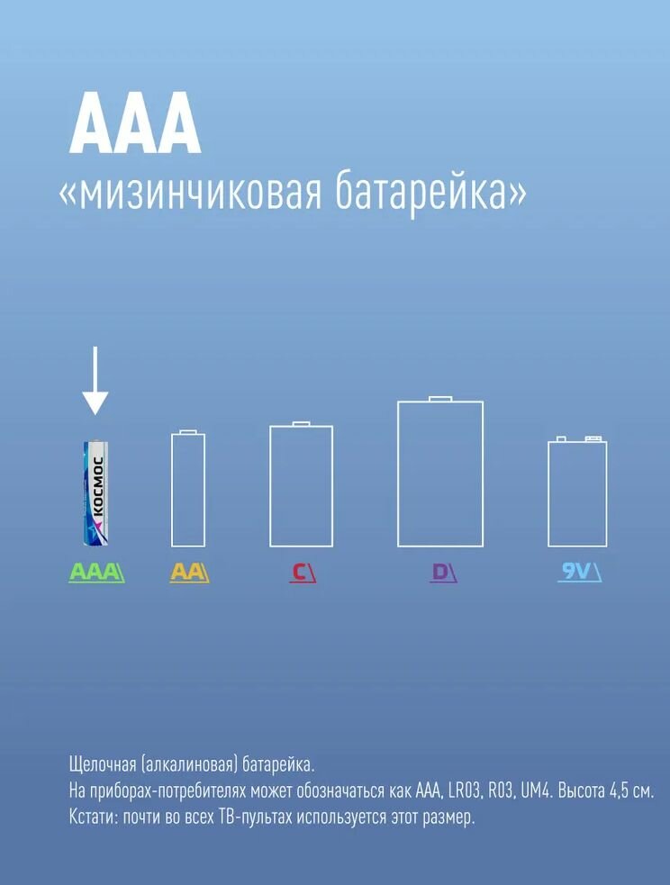 Батарейка космос Alkaline ААА (R03, FR03, LR03, HR03, ZR03), в упаковке 4 шт.