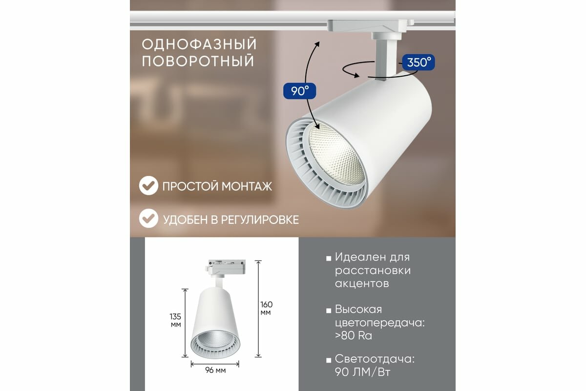 СохранитьСветильник трековый светодиодный на шинопровод 30W, 2700 Lm, 4000К, 35 градусов, белый, AL100 интересное:
