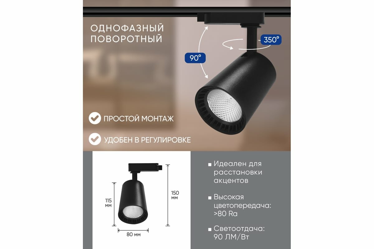 Светильник трековый светодиодный на шинопровод 12W, 1080 Lm, 4000К, 35 градусов, черный, AL100