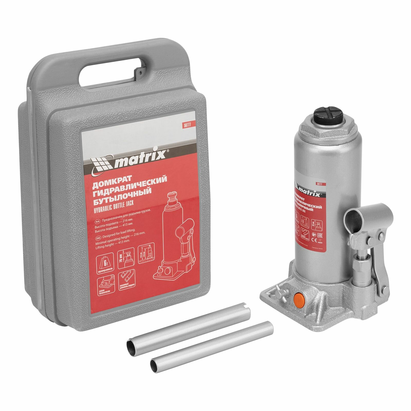 Домкрат гидравлический бутылочный, 6 т, h подъема 216-413 мм, в пластиковом кейсе Matrix ( 50777 )