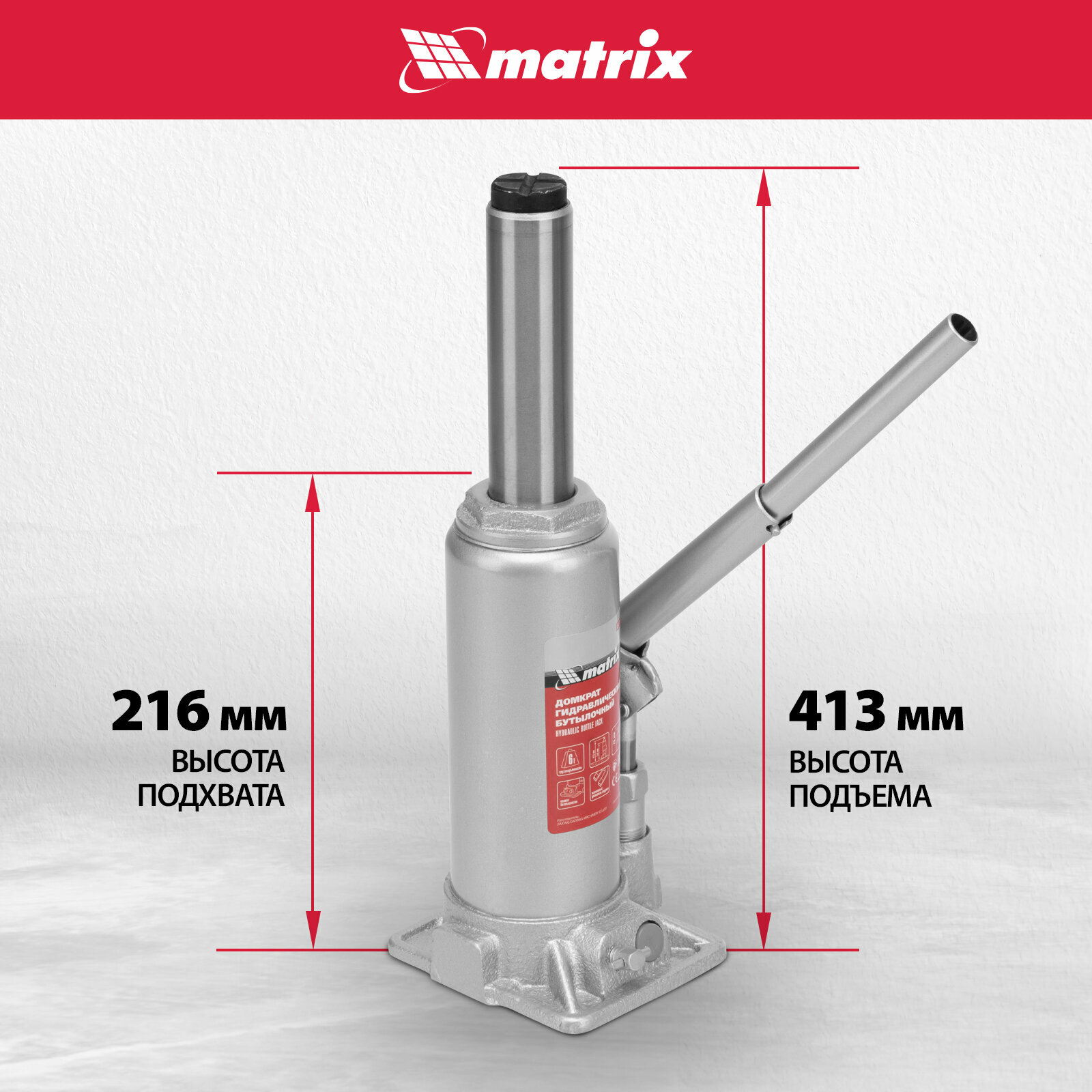 Купить Домкрат гидравлический бутылочный, 6 т, h подъема 216-413 мм, в пласт. кейсе Matrix