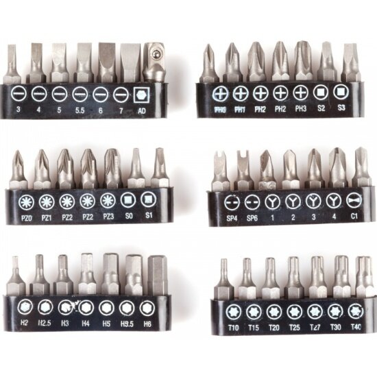 | Биты подробно | 25 мм: SL3, SL4, SL5, SL5.5, SL6, SL7, PH0, PH1, PH2, PH2, PH3, PZ0, PZ1, PZ2, PZ2, PZ3, S0, S1, S2, S3, T10, T15, T20, T25, T27, T30, T40, H2, H2.5, H3, H4, H5, H5.5, H6, SP4, SP6, C1, TW1, TW2, TW3, TW4, AD |
