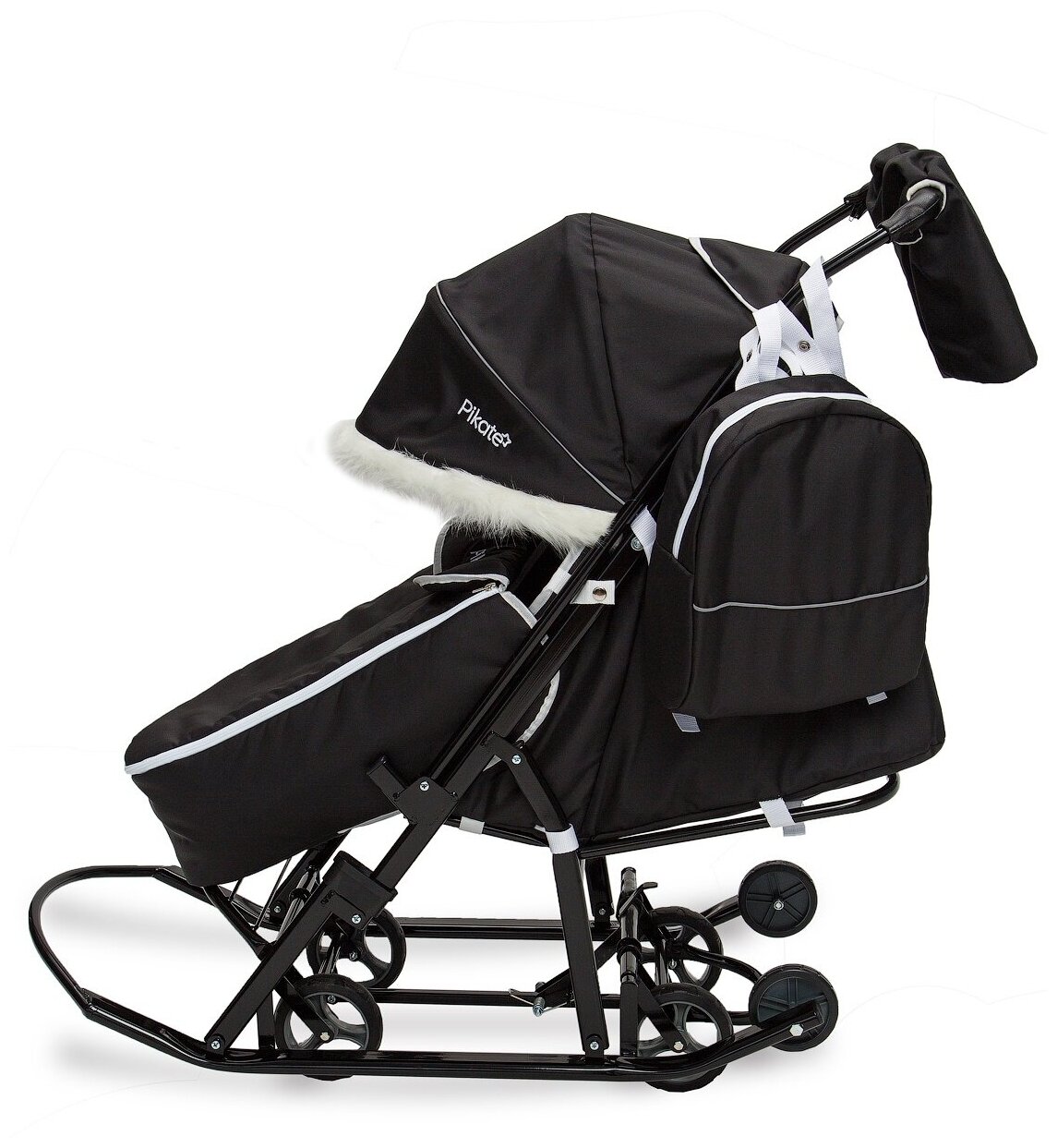 Санки-коляска Pikate Арктик, перекидная ручка, конверт, сумка, варежки, цвет: белый/черный каркас