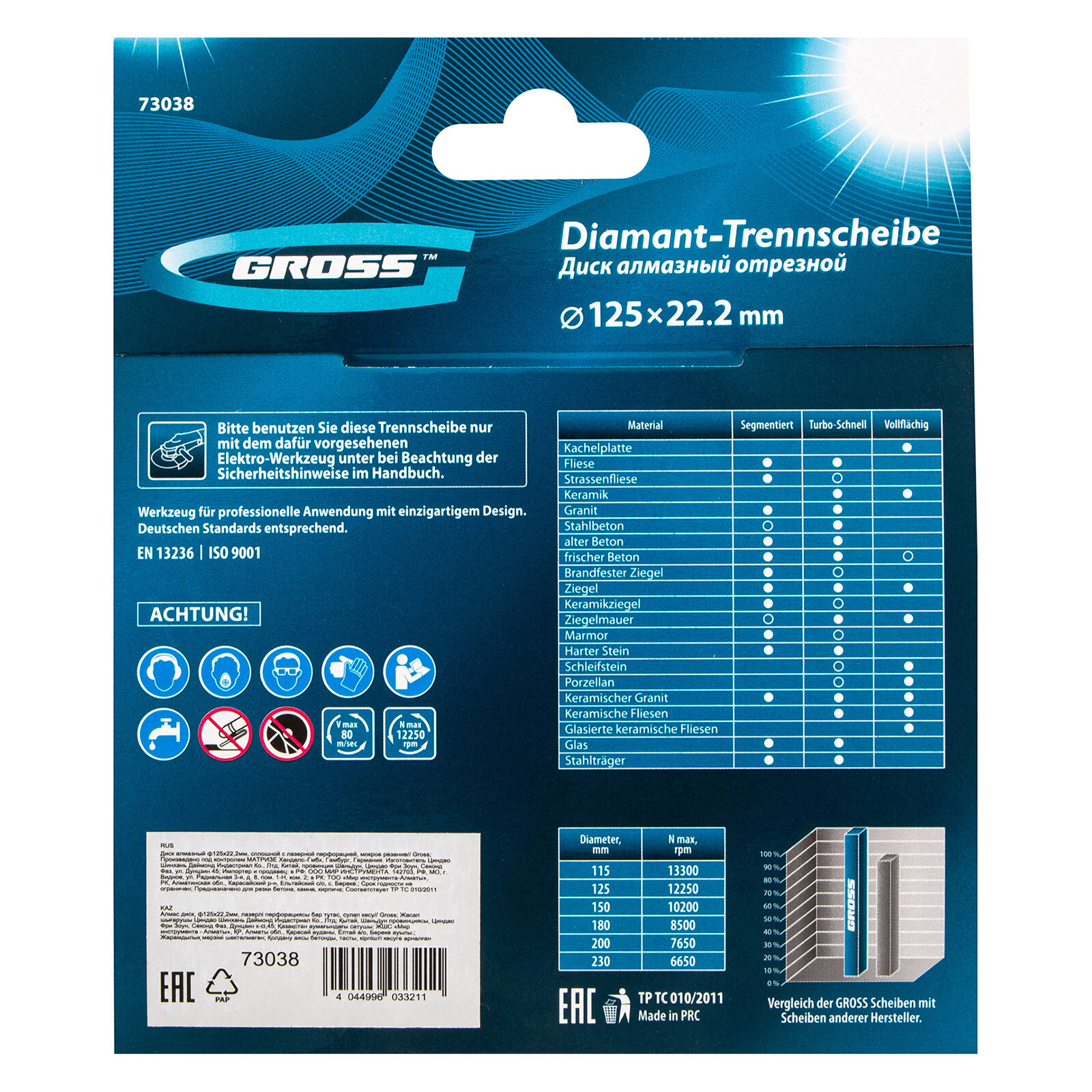 Купить Диск алмазный Gross ф125х22,2мм, сплошной c лазерной перфорацией, мокрое резание 73038