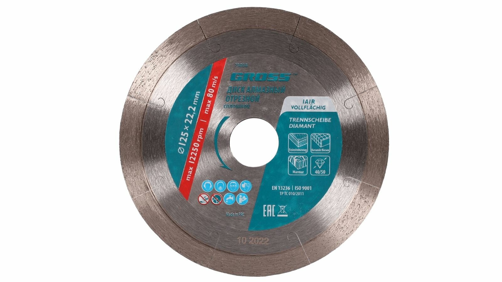 Диск алмазный, 125 х 22,2 мм, сплошной c лазерной перфорацией, мокрая резка Gross 73038