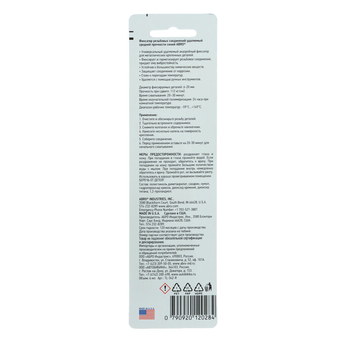 ABRO Фиксатор резьбы синий ABRO, 6 мл, удаляемый TL-342