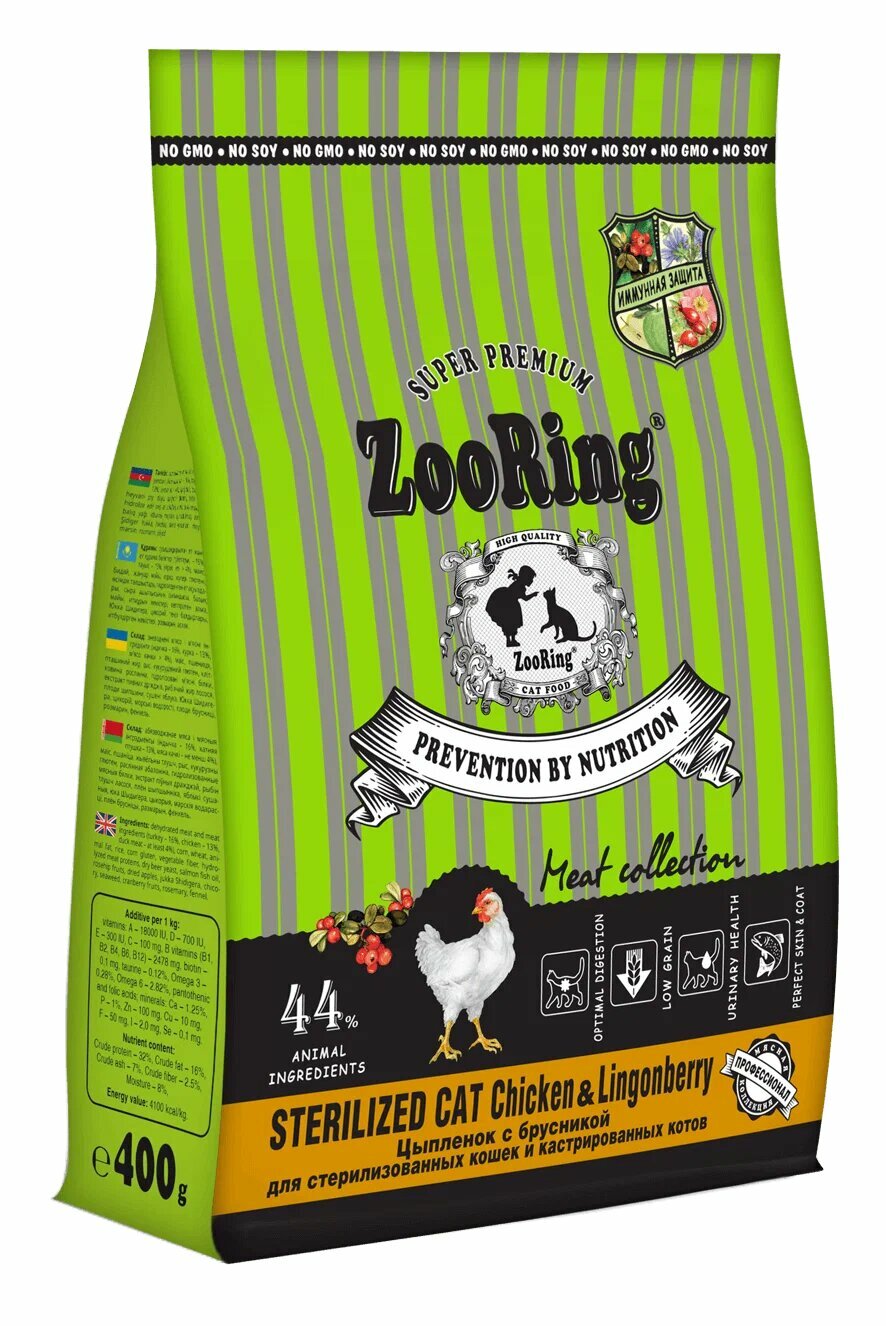 ZooRing Корм сухой для стерилизованных кошек Sterilized Cat Chicken Lingonberry Цыпленок с брусникой, 0,4кг