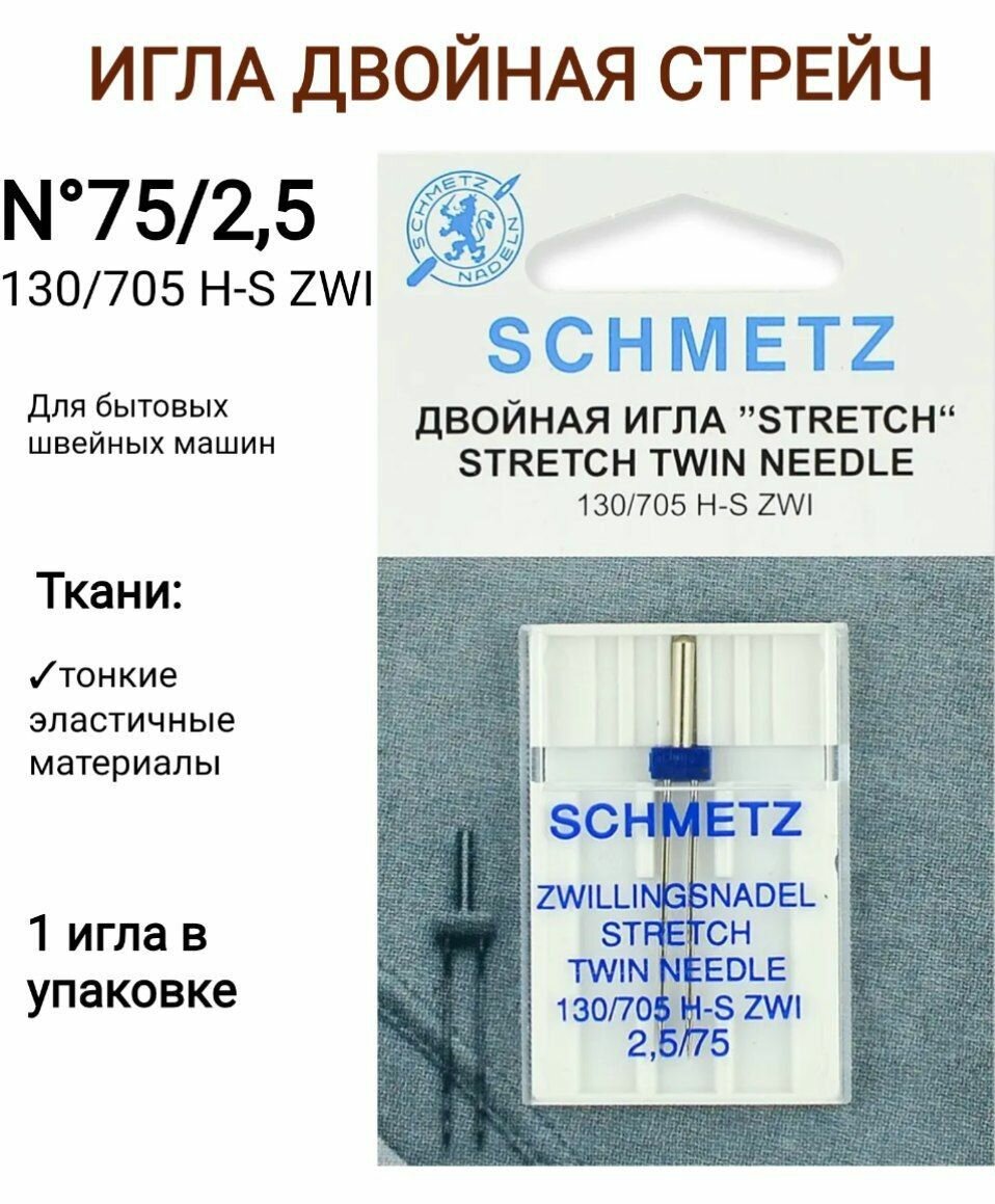 Швейные иглы стрейч двойные № 75/2.5, 1 штука, Schmetz 130/705Н-S ZWI для швейных машин