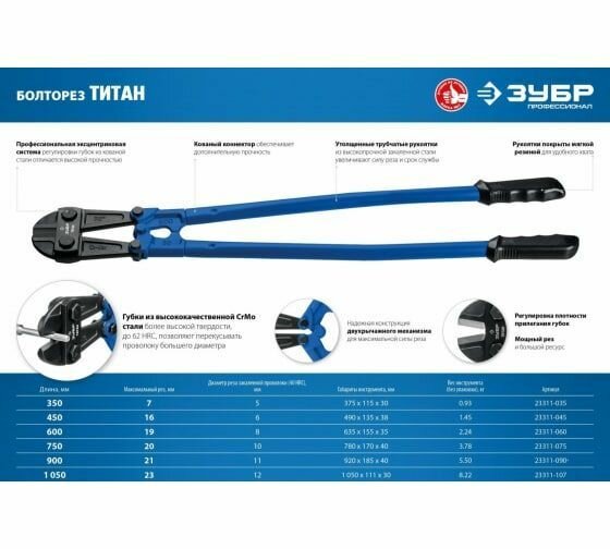 Зубр Болторез Зубр Профессионал 23311-107_z01 Cr-Mo кованый коннектор 62HRC 1050мм до d23мм / 40HRC до d12мм