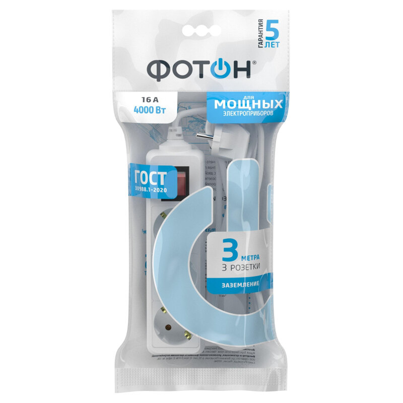 Удлинитель сетевой для розетки фотон 16А 5м 3 розетки с заземлением белый, ГОСТ