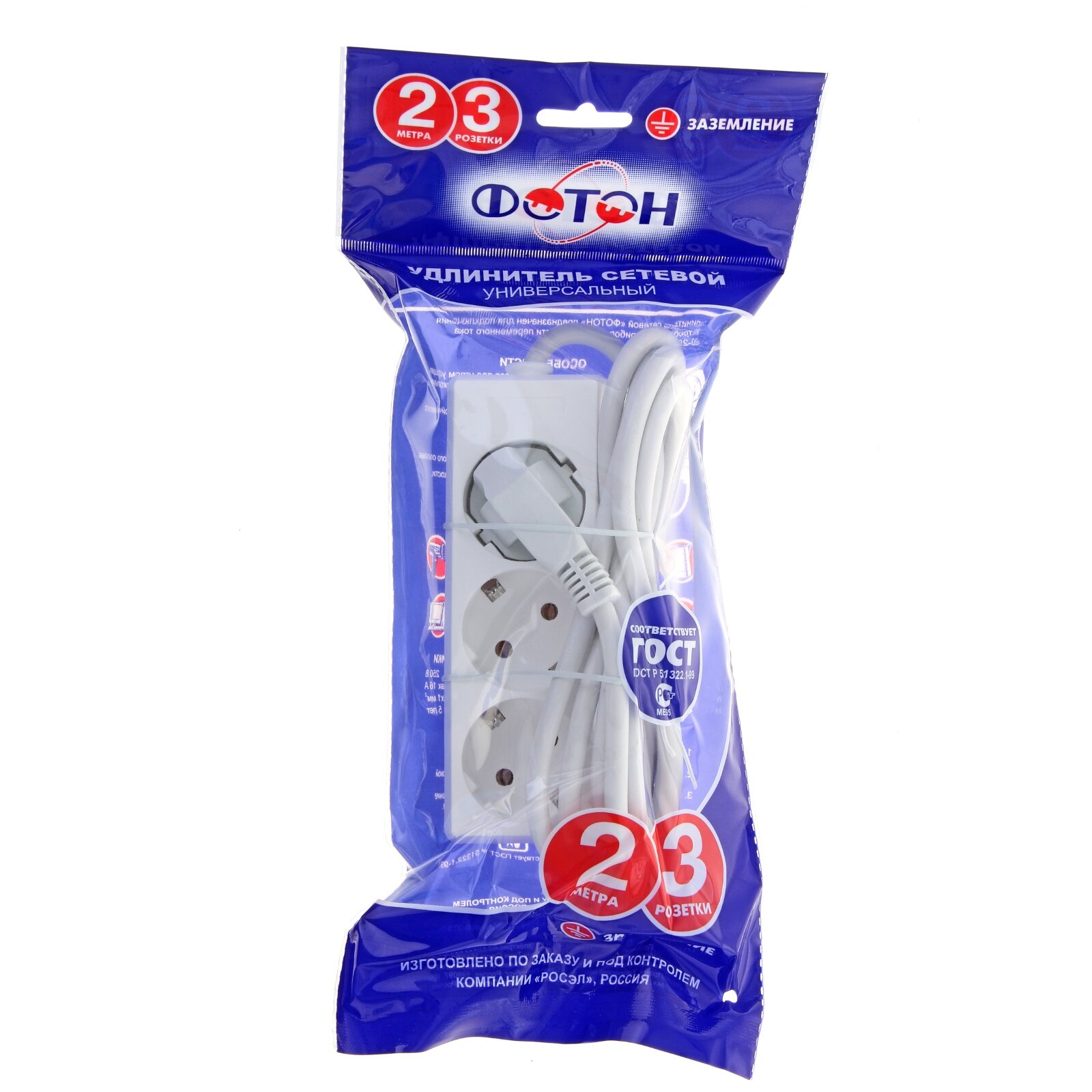 Удлинитель сетевой фотон 16-33Е [1х3], 3м, 16А, с заземл, Белый, росэл 11848 (1 шт.)
