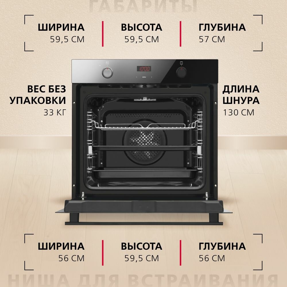 Купить Электрический духовой шкаф Hansa BOES683020, встраиваемый, 60 см, 77 л, 9 режимов, с дисплеем, таймером, конвекцией, грилем, быстрым нагревом, телескопическими направляющими, черный
