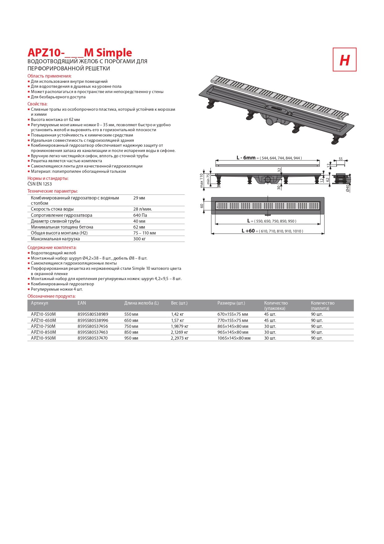 APZ10 Simple Водоотводящий желоб с порогами для перфорированной решетки, AG100401850
