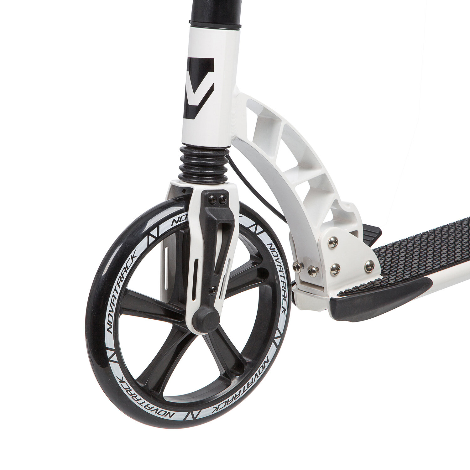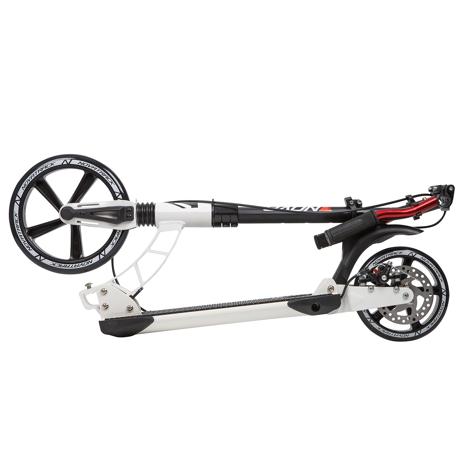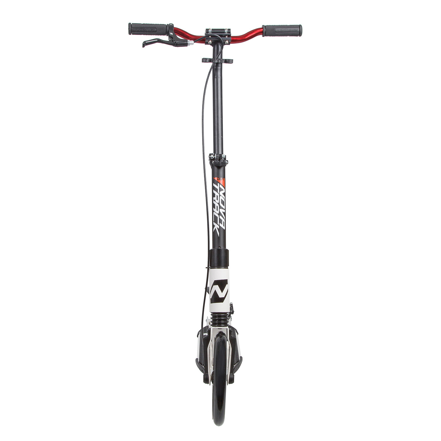 Самокат для детей NOVATRACK DEFT PRO алюм., передний и задний амортизатор, колеса 250*200 мм PU, эргономичный Y-руль с фиксатором складных рукоятей, платформа с резиновым верхним покрытием, дисковый тормоз, черно-белый