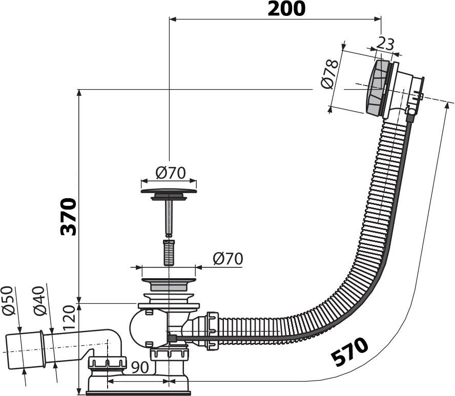 Сифон для ванны Alcadrain регулируемый полуавтомат с выпуском d70 мм с переливом (A55KM/AG210125260)