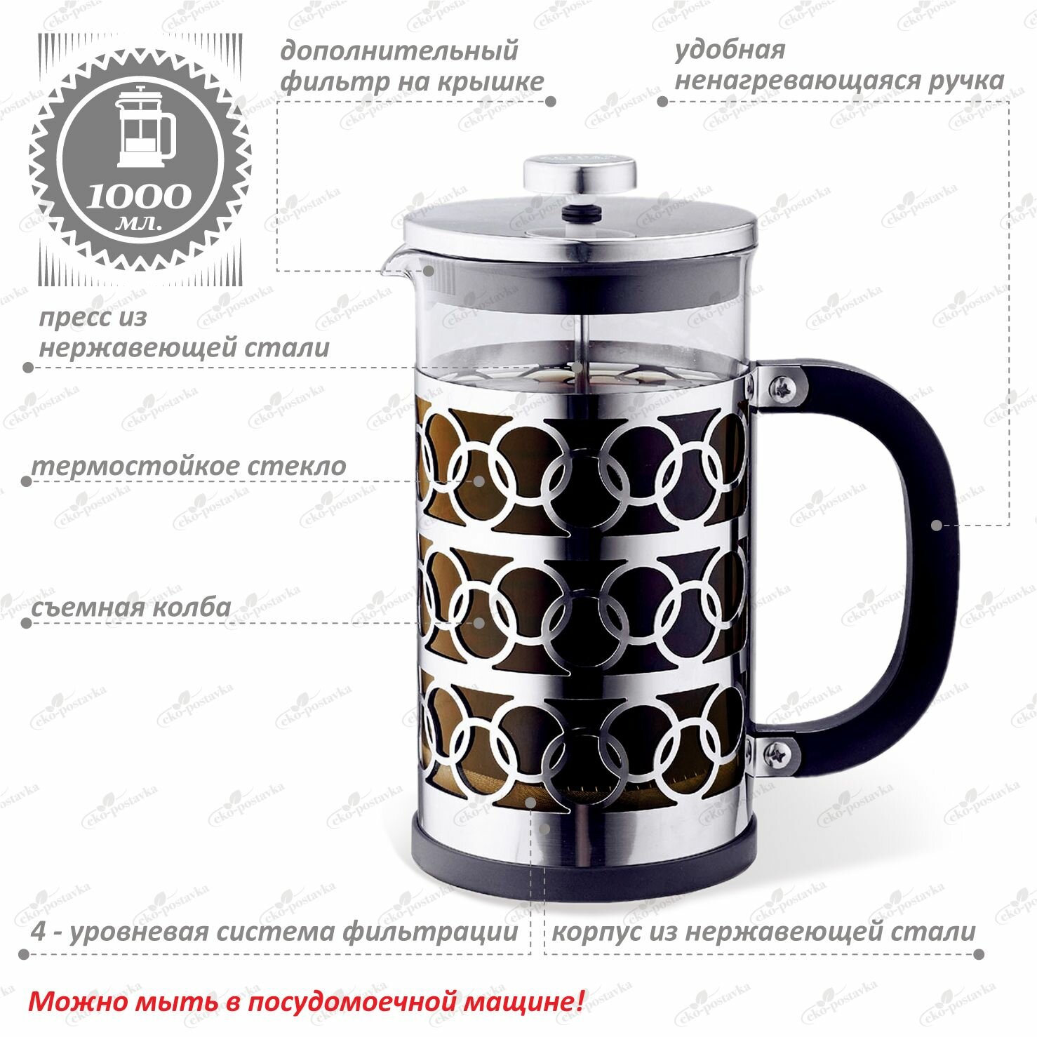 Купить Френч-пресс стеклянный 1 литр прозрачный Zeidan из нержавеющей стали заварник для чая и кофе из термостойкого стекла