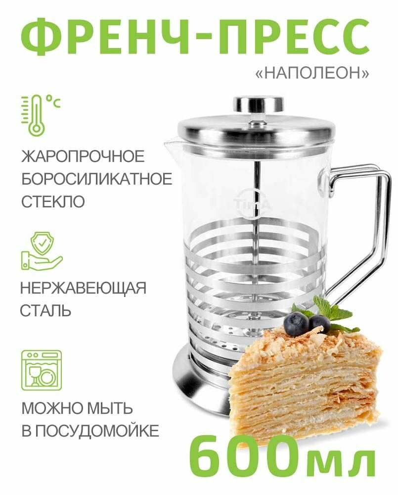 Френч-пресс "НАПОЛЕОН" нержавеющая сталь, боросиликатное стекло. (TIMA Френч-пресс "НАПОЛЕОН" 600мл. нержавеющая сталь, боросиликатное стекло. FG-600)
