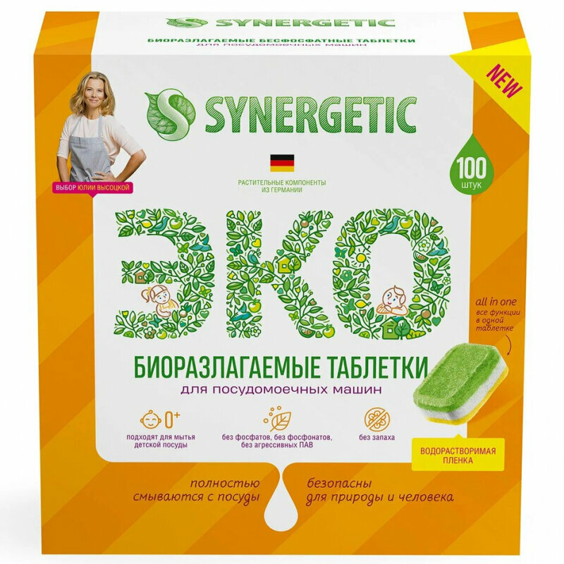 Таблетки для посудомоечных машин бесфосфатные Synergetic, без запаха, 100 шт