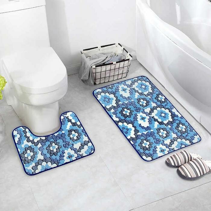 Набор ковриков для ванны и туалета 2 шт 40х50, 50х80 см "Голубые цветы"