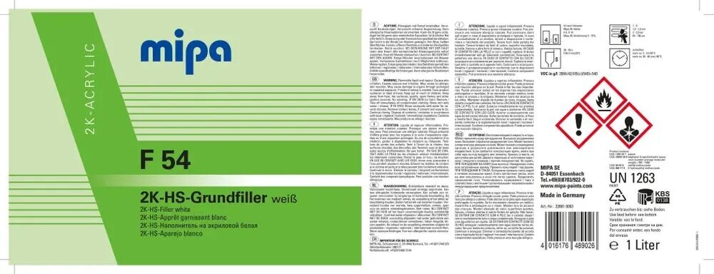 Купить Грунт выравниватель акриловый Mipa F54 2K HS белый 1 л. с отвердителем 0,25 л.