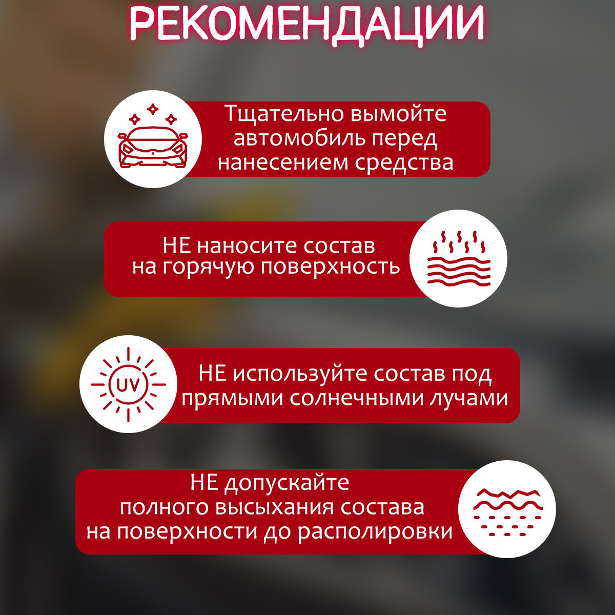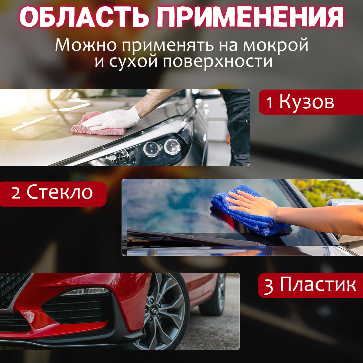 | Способ применения | - тщательно вымойте автомобиль - взболтайте перед использованием - наносите состав поэлементно на мокрую или сухую поверхность - распылите состав на микрофибру и распределите по поверхности - располируйте сухой чистой микрофиброй - не применяйте на горячих поверхностях и под прямыми солнечными лучами - не допускайте полного высыхания состава на поверхности до располировки |
