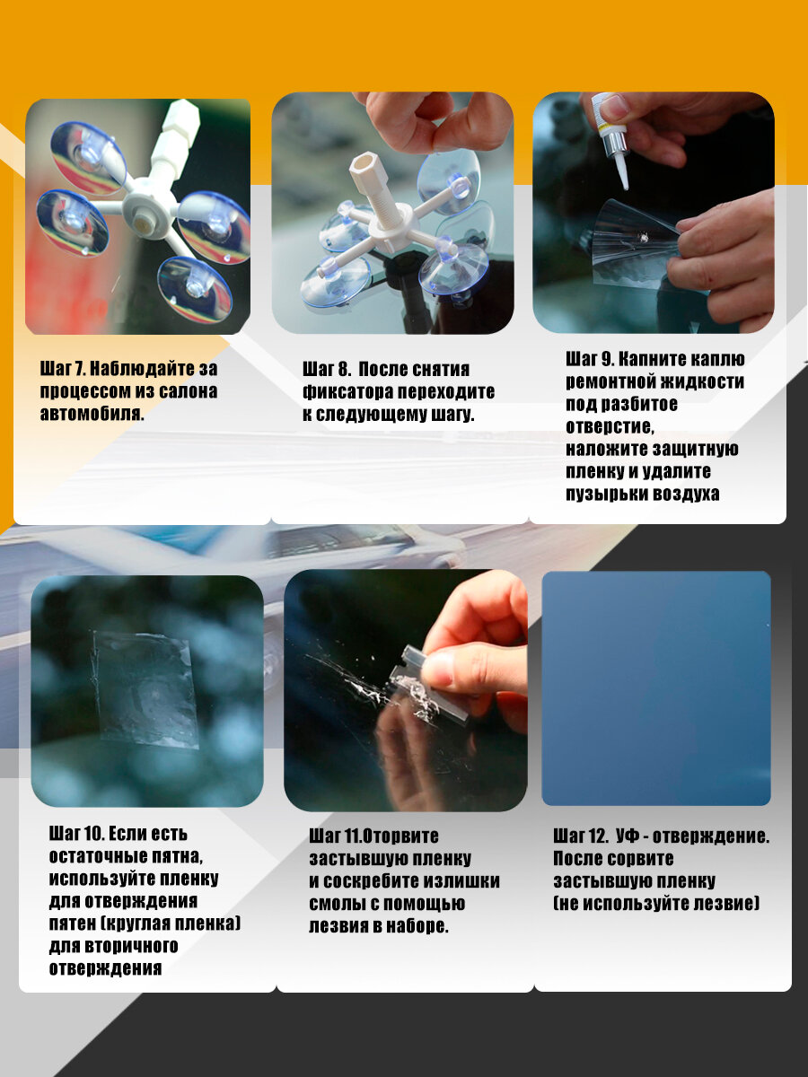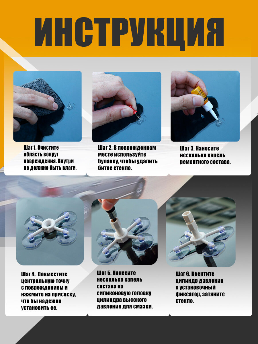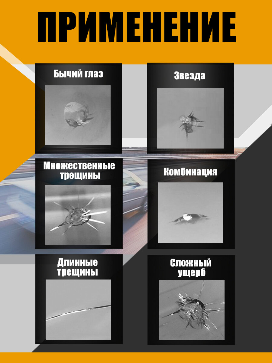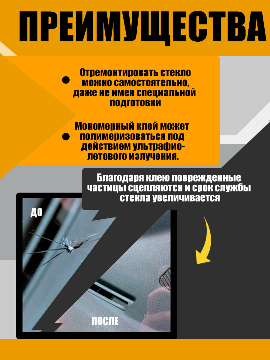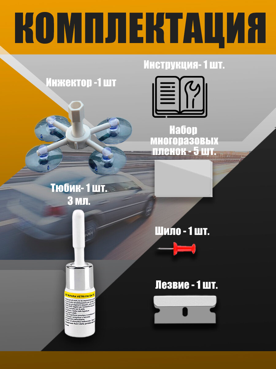 Комплект для ремонта трещин и сколов на лобовом стекле интересное: