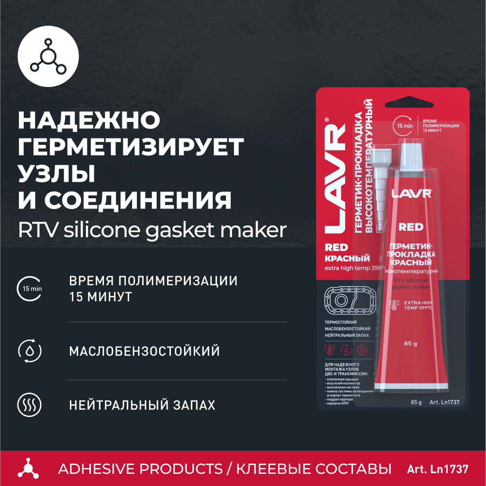 | Подробная комплектация | Герметик-прокладка красный высокотемпературный Red, 85 г LAVR - 1шт |